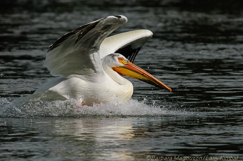 American White Pelican [Pelecanus erythrorhynchos] splash landing; Fishing Bridge, Pelican Creek, Yellowstone NP, WYAn American White Pelican touch down.