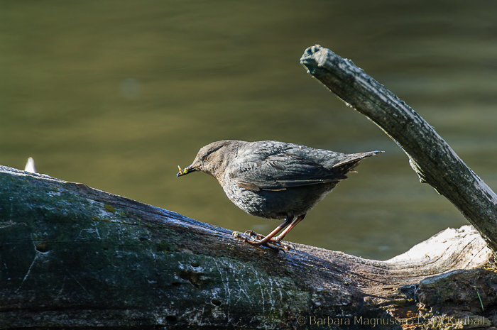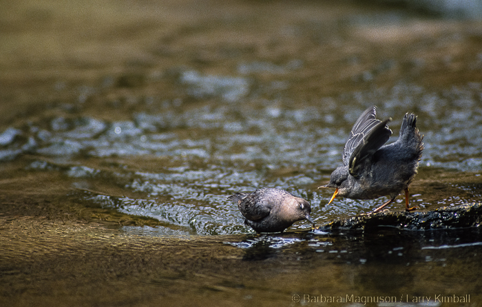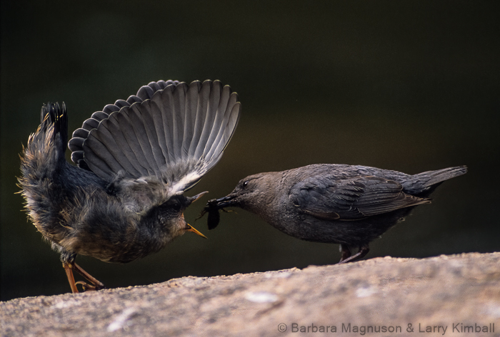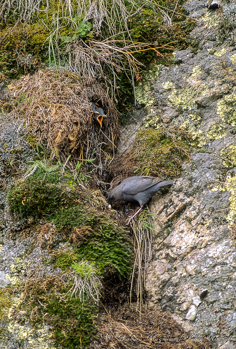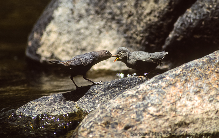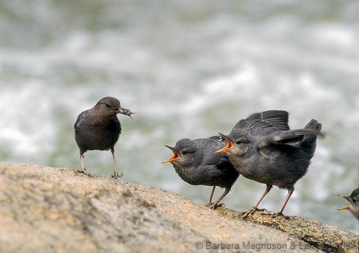 We have arrived in mid-May and although there has been a lot of snow this spring and snow still remains on the north facing slopes, there are fledglings out on the river boulders demanding to be fed by their attentive parents. Still, further up stream another Dipper pair is busily tending the gaping mouths of three nestlings which are poking out of the arch-shaped entrance of a nest precariously wedged in a fissure of a rock wall. Bundled in our winter attire, doing our best to blend with our environment, we quietly position cameras and selves across the river to watch and photograph.