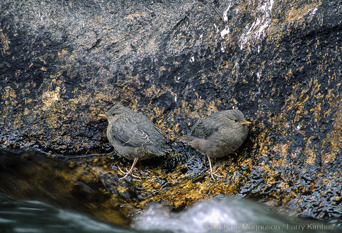 At about 25 days of age, the juveniles tentatively leave their nest, stepping out onto the nearest reasonably level ledge where they will perch and dip until they develop enough curiosity and strength to explore the immediate area. Since a young Dippers’ flying and swimming skills are limited, they stay close to the nest and are delivered shipments of food by their ever-vigilant parents.