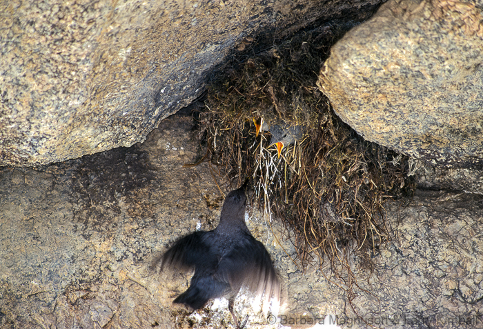 As with most bird species, the nestlings remain silent until they hear an adult returning with a beak full of river potluck. Long before I hear the parent bird, their open yellow mouths are thrust out the nest entrance in anticipation. As fast as my camera shutter opens and closes, the adult Dipper has swooped in, popped a morsel or two into the mouths of the hungry nestlings and flown off without missing a wing beat. Both parents, while taking time to eat and rest, share the duty of supplying food to the babies until they are old enough to venture out on their own.