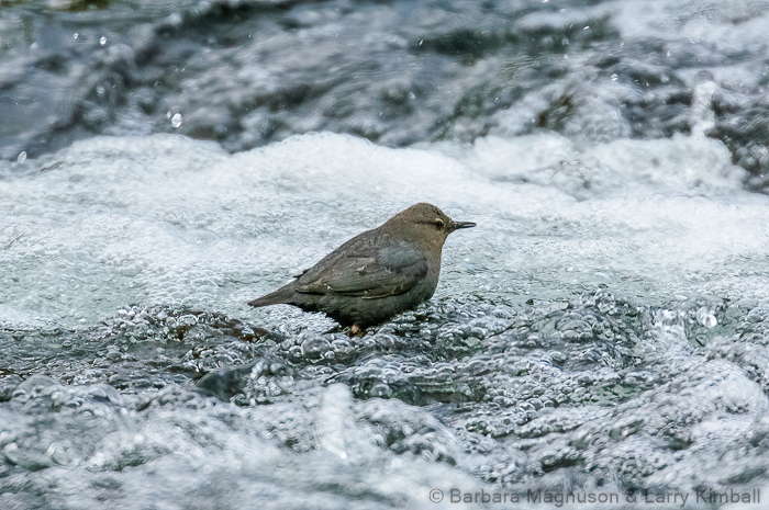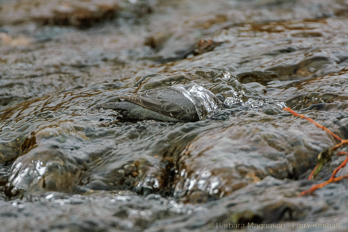 Each day, we would arrive to find the three fledglings farther and farther from the nest and as we would soon see, this was not always intentional. They would try out their wings with short trips back and forth to nearby boulders. As the river beckoned, they would wade in and out, then stand dipping while waiting for their parents to return with food. With each passing day the juvenile Dippers would become stronger and braver. Their wading attempts became swimming attempts and while swimming in protected pools became easy, the fast-flowing river was another matter. A fledgling would find itself swept downstream if it ventured out into the water too far or misjudged its landing. The Dipper parents were constantly on the go, tending increasing food demands while keeping track of their young spread out along the river.