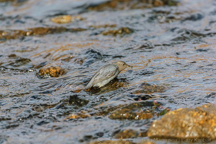 The abundance of food in a swift moving mountain stream is remarkable. Dippers fish a 1/2 to 1 mile stretch of river territory; an area vigorously defended by the breeding pair during nesting season. The Dippers I watched rarely surfaced without a beak full of caddis fly larva, of which they seem especially fond, mosquito, midge, mayfly, or stone fly larvae, water bugs and beetles, small fish, clams and even snails. Whether the prey is floating, frozen or underwater, it makes no difference.