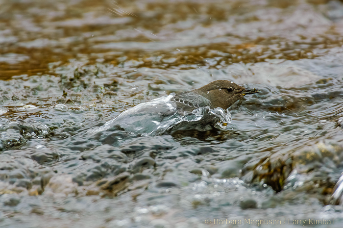 All these accessories make up a bird that swims on the surface of a icey mountain stream by rapidly paddling it’s unwebbed feet, literally flies underwater through 20 feet of water to reach feeding places, and is able to fly from beneath the water’s surface and continue out over the river in a quail-like buzzing flight. Dippers can dive into water directly from flight, from a boulder or from the surface of the water and may remain submerged up to 30 seconds.