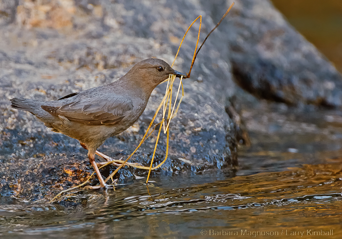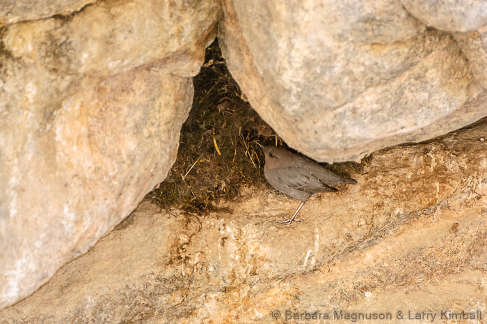 I am walking along the lower Platte River as it courses through Eleven Mile Canyon, looking for the nests of this aquatic songbird. Aside from the roar of the river, another dominating sound echoes between the canyon walls above the rumbling mountain torrents. It is the wren-like song of the American Dipper [Cinclus mexicanus], more whimsically called the American Water Ouzel. One of four species in the world and the only one in North America, this is the only true aquatic songbird, related to the wrens and thrushes with characteristics of both. Dippers live at elevations from 2,000 to 10,500 feet, ranging from the Aleutian Islands, north-central Alaska, south to central Alberta, southwest South Dakota, southern California, Mexico and western Panama. Two other relatives live in Europe and in the Andes of South America. We were here to try to photograph the nesting behavior of these amazing sooty-gray birds.