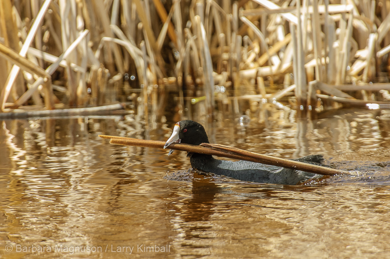American Coot [Fulica americana], adult carrying a thick cattail reed for building material for a nest under construction nearby along the shore of a wetland channel hidden by cattails; Alamosa NWR., Colorado