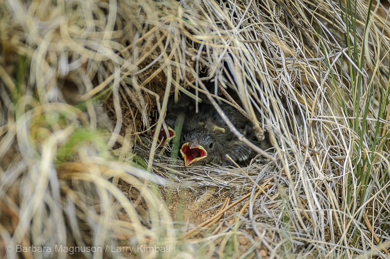 Dark-eyed Junco [Junco hyemalis] are among the ground nesters that take advantage of low to the ground cut banks, drainages and thick grasses and scrub to excavate small dirt burrows to place their nests and house their young.