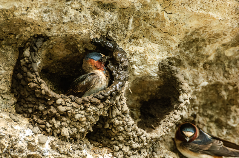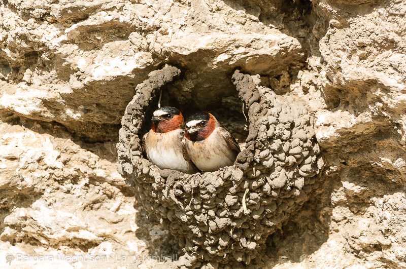 Cliff Swallow [Petrochelidon pyrrhonota] pair trying out their new abode; Soda Butte, Yellowstone National Park, Wyoming