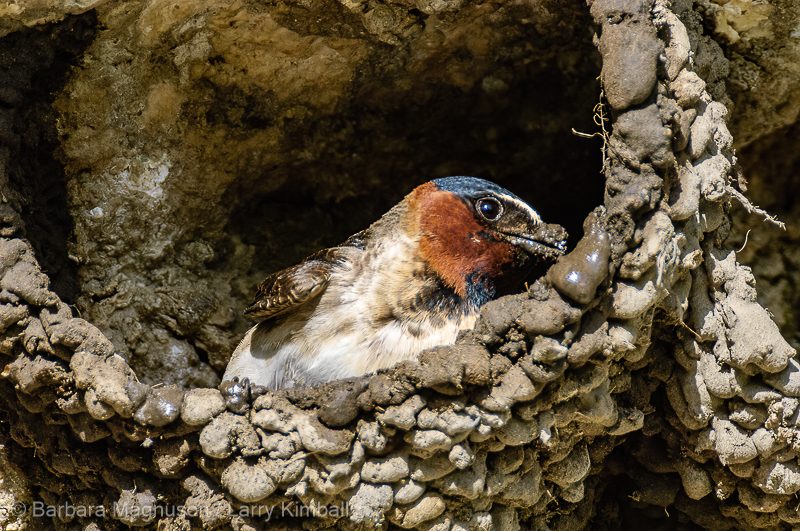 Cliff Swallow [Petrochelidon pyrrhonota] breeding adult hard at work. With a little spit and wet mud, drop by drop a nest is built; Soda Butte, Yellowstone National Park, Wyoming