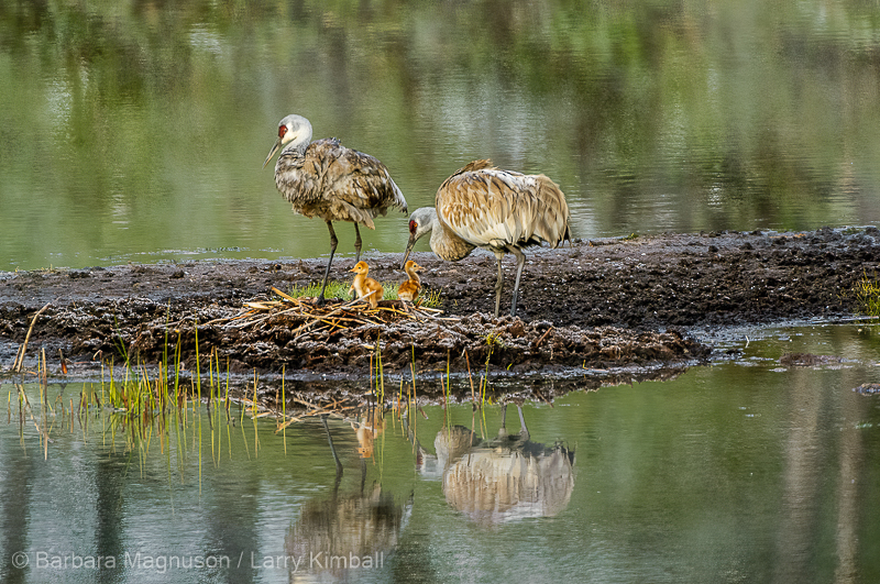 Greater Sandhill Crane [Grus canadensis] adult pair caring for 2 new chicks (colts) at nest; Floating Island Lake, Yellowstone National Park, Wyoming