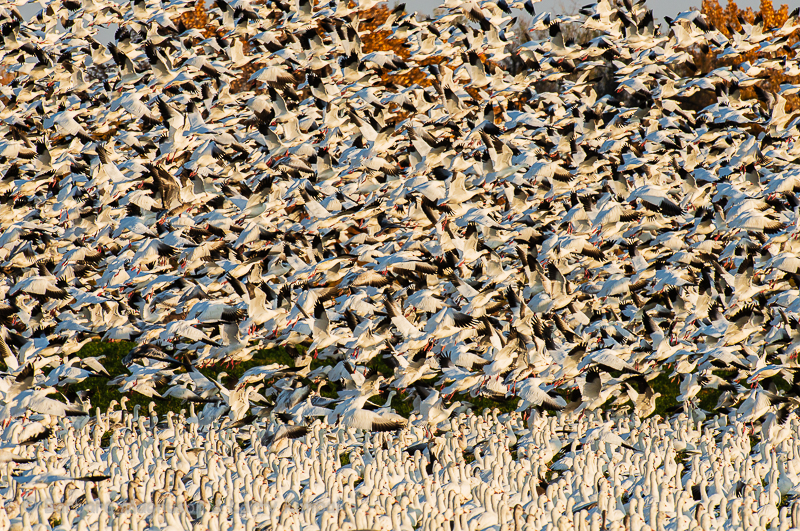 Snow Geese [Chen caerulescens] by the thousands take flight en mass at Bosque del Apache National Wildlife Refuge, NM. Stand next to and under a flock this large, overwhelmed by the din of geese chatter and you will be awestruck. The annual migration spectacle is an experience to behold.