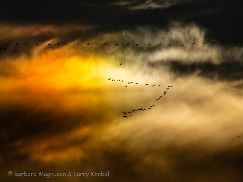 Snow geese [Chen caerulescens] trailing through the sky to their night roosts during an gorgeous sunset at Bosque del Apache National Wildlife Refuge, New Mexico. Skies and weather events can be the source of speechless awe.