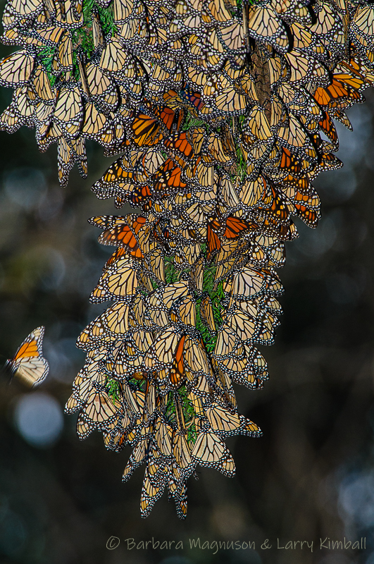 Monarch Butterflies [Danaus plexippus] gather for warmth during their winter migration, clustering on tree branches inside eucalyptus forest grove at Pismo Beach, CA