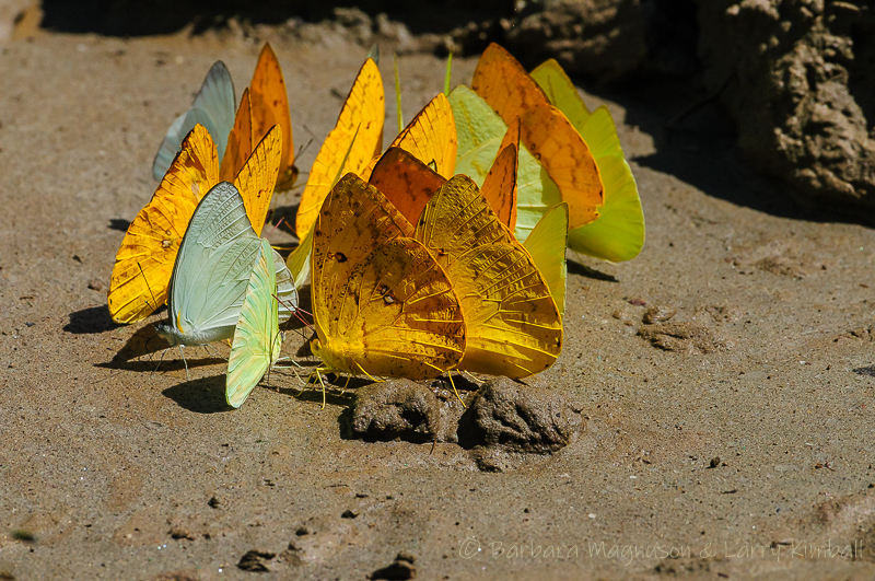 [Phoebis philea (Orange-barred Sulphur); Rhabdodryas trite (Straight-line Sulphur); Pieridae] Butterfly congregation puddling along Napo River shore for minerals and nutrition; Napo Wildlife Center, Yasuni National Park, Ecuador