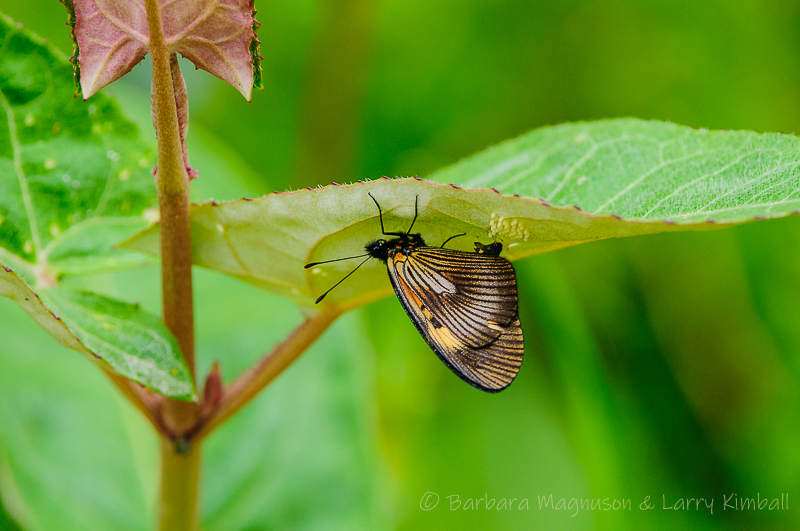 Jordan’s Altinote [Altinote hilaris, Nymphalidae subfamily – Acraeinae] butterfly laying eggs on underside of leaf; San Isidro Reserve, Ecuador